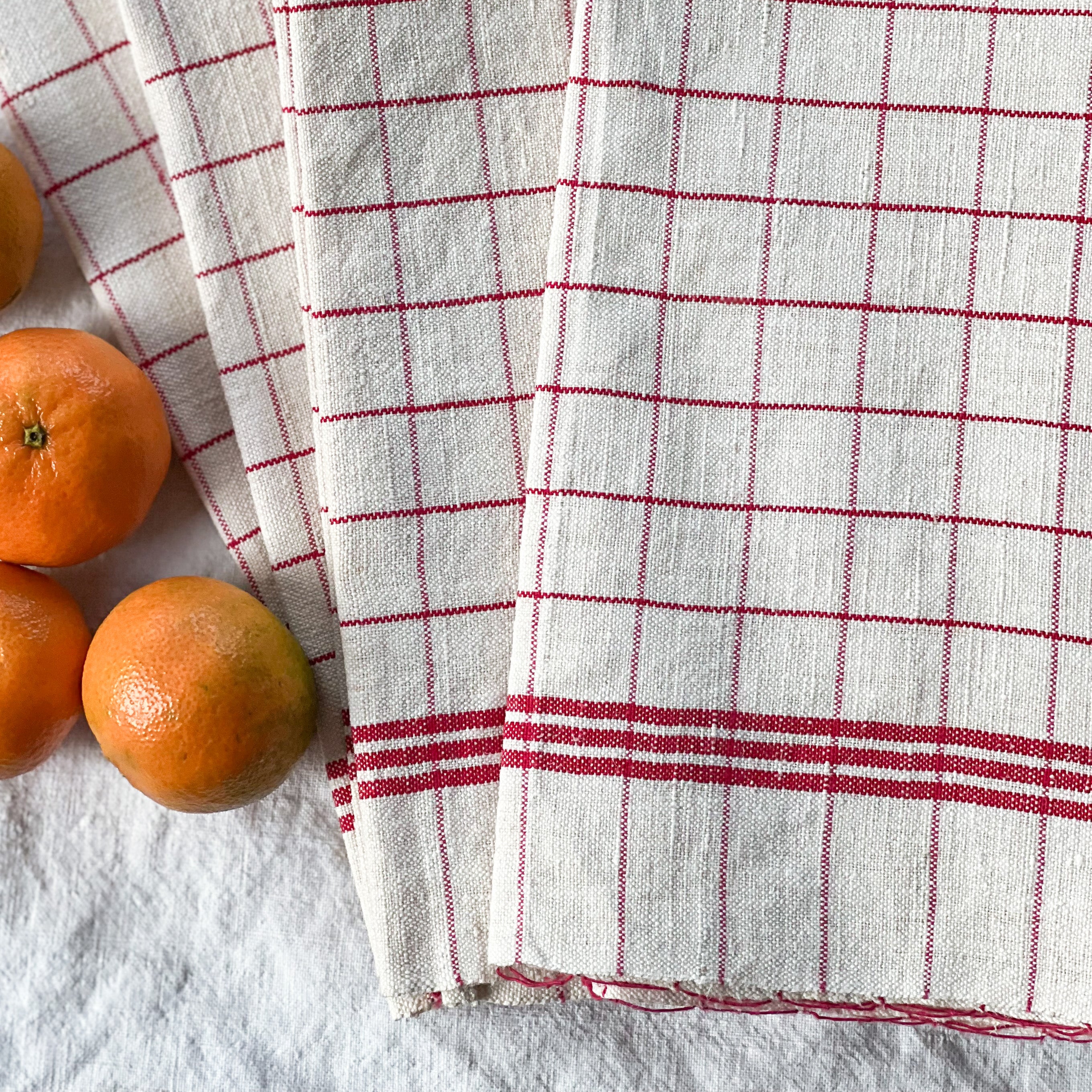 A set of four linen tea towels made of red and white plaid linen. In beautiful, vintage condition, measuring 62 x 56 cm.